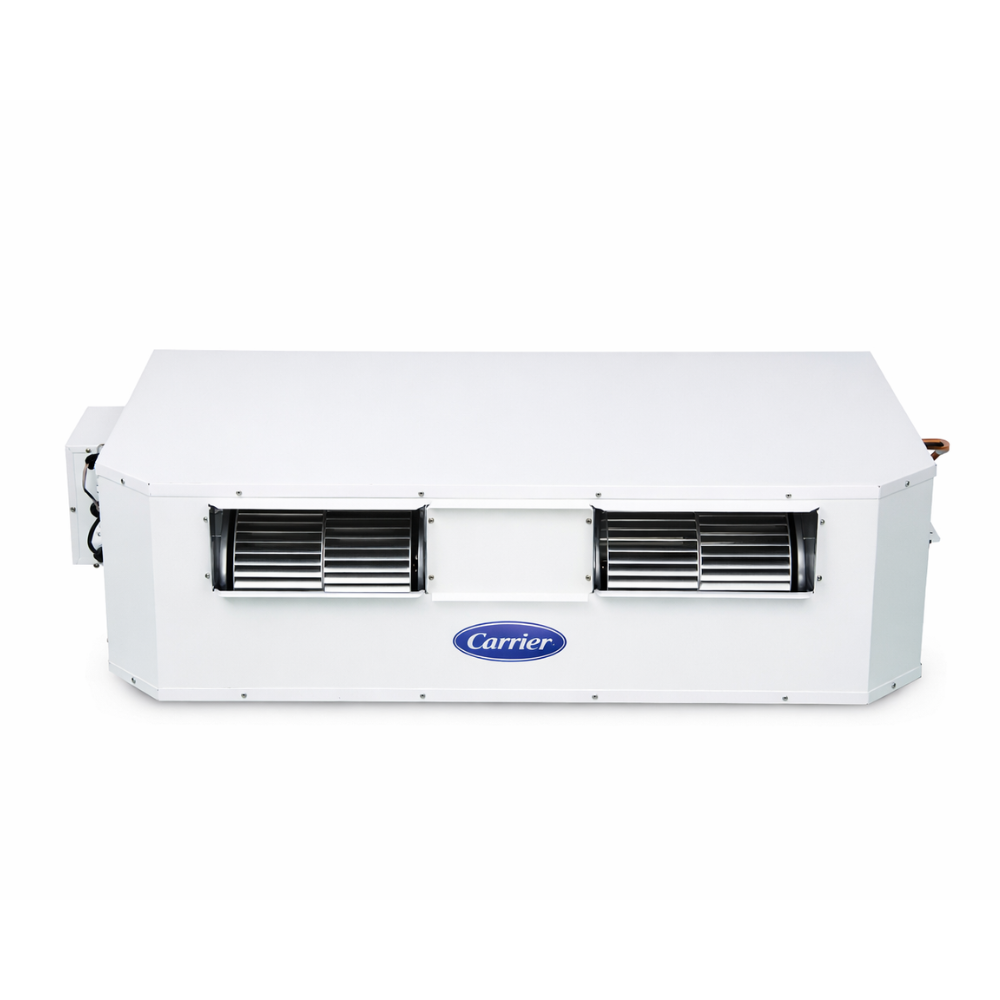 The Carrier Non-Inverter Ductable 4.0 TR Air Conditioner is a reliable and high-performance cooling solution designed for large commercial spaces such as offices, showrooms, restaurants, banquet halls, and retail outlets. Built with R410A eco-friendly refrigerant and a robust rotary compressor, this system delivers a nominal cooling capacity of 48,000 BTU/hr (14,068 watts) with powerful and uniform air distribution through a direct-driven DIDW centrifugal fan. It features efficient performance with thermostatic expansion control, internally grooved copper tubes, and dual sine-wave fin design for enhanced heat transfer and durability. The unit is engineered for Indian conditions with wide operating voltage range, silent operation, and easy servicing through removable panels and quick-lock fittings. Safety and reliability are ensured through built-in electrical protections such as surge protection, reverse phase protection, under/over-voltage protection, phase loss protection, and compressor overload protection, along with LP and HP switches to prevent system damage. The system also includes a microprocessor-based wired remote control with features like fault code display, filter clean timer, auto-restart enable/disable, and Modbus (RS485) communication support for BMS integration. With a compact outdoor unit footprint and durable powder-coated construction, the Carrier 4.0 TR ducted AC offers energy-efficient, quiet, and dependable cooling for large commercial environments requiring uniform temperature control and long-term operational reliability.