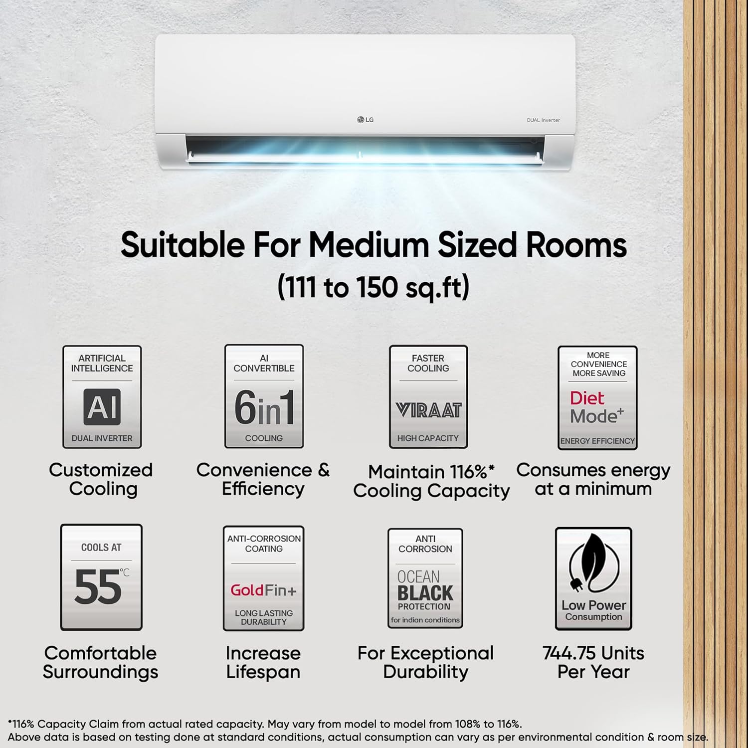 This LG Split AC with DUAL Inverter Compressor delivers powerful, fast, and consistent cooling while operating quietly and efficiently, ensuring long-lasting performance compared to conventional models. With a 1.5 Ton capacity, it is ideal for medium-sized rooms ranging from 111 to 150 sq.ft and offers excellent air circulation of 653/1236 CFM (Indoor/Outdoor), a cooling capacity of 5000 W, and reliable performance even at ambient temperatures up to 55°C with 4-way air swing. It features a 5 Star energy rating with an annual energy consumption of 744.75 units and an ISEER value of 5.20 (as per 2025 BEE guidelines; under 2026 guidelines, it will be rated one star lower). The manufacturer provides a 1-year comprehensive warranty on the product, 5 years on PCB and motor, and 10 years on the compressor (free gas charging during the comprehensive period only, T&C apply). Built with 100% copper tubes and Ocean Black Protection, the unit ensures enhanced durability, uninterrupted cooling, and resistance against rust and corrosion. Key features include Dual Inverter Compressor, AI Convertible 6-in-1 mode, VIRAAT mode, HD filter with anti-virus protection, ADC sensor, stabilizer-free operation within a 120V–290V range, Magic LED temperature display, low noise levels (31 dB for indoor unit and 56 dB for outdoor unit), and a powerful 15-meter air throw. Special features such as Gold Fin+, Ez Clean filter, low gas detection, smart diagnosis system, comfort air, monsoon comfort/fresh dry, auto clean, mute function, sleep mode, auto restart, dehumidifier, Diet Mode Plus, and 6 fan speed steps further enhance user comfort and efficiency. It uses eco-friendly R32 refrigerant gas with zero ozone depletion potential and lower global warming potential. The indoor unit measures 99.8 × 34.5 × 21 cm and weighs 11 kg, while the outdoor unit measures 77 × 54.5 × 28.8 cm and weighs 30 kg. The package includes one indoor unit, one outdoor unit, a 3 m interconnecting copper pipe, one remote, user manual, and warranty card, with brand warranty available using the Amazon invoice and the user manual accessible from the brand website.