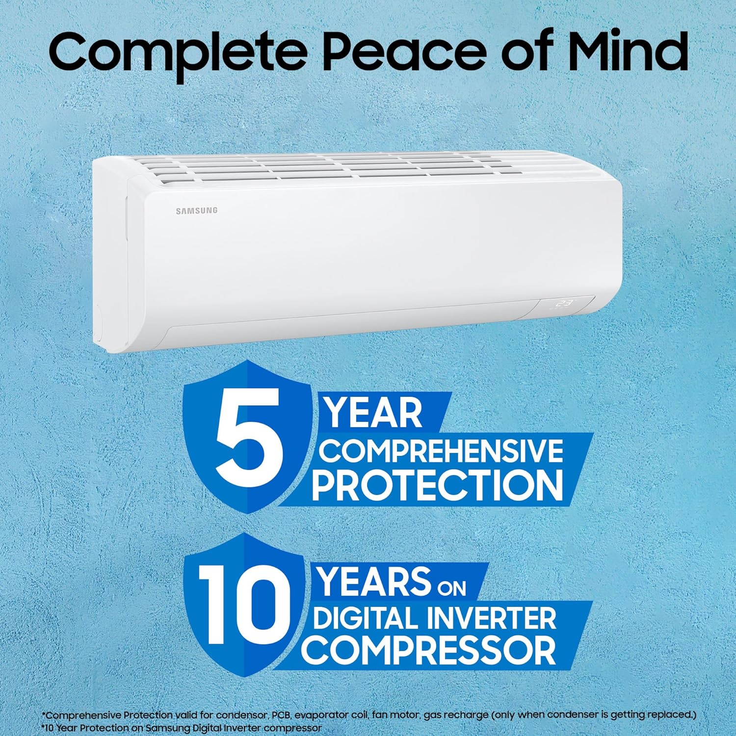 This Split AC with digital inverter compressor features a variable speed compressor that automatically adjusts power based on heat load and includes Convertible 5-in-1 modes for flexible cooling according to your needs. The 1 Ton capacity makes it ideal for medium-sized rooms ranging from 80 to 110 sq ft. It comes with a 3 Star BEE energy rating, Power Saving Mode, and an impressive ISEER rating of 4.32 W/W, with annual electricity consumption of approximately 626.62 units. The unit offers a 5-year comprehensive product warranty, an additional 5 months warranty for purchases made between 22nd September 2025 and 10th November 2025, and a 10-year warranty on the digital inverter compressor (brand warranty applicable with seller invoice). Built with a copper condenser coil for efficient cooling and low maintenance, it includes advanced features such as 5 Step Convertible cooling, Digital Inverter Technology, 3 Step Auto Clean, Durafin Ultra coating, Triple Protection Plus, copper anti-bacterial filter, and coated copper tubes. Special highlights include fast cooling performance and the ability to cool even at extreme temperatures up to 58°C. It uses eco-friendly R32 refrigerant gas with no ozone depletion potential and low global warming impact. The indoor unit measures 82 × 29.9 × 21.5 cm and weighs 9 kg, while the outdoor unit measures 71 × 54 × 22 cm and weighs 21 kg. The package includes one indoor unit, one outdoor unit, a remote control, connecting wire (3.5 m), copper pipe (3 m), power cord (2 m), and two batteries, with the user manual accessible from the brand website.